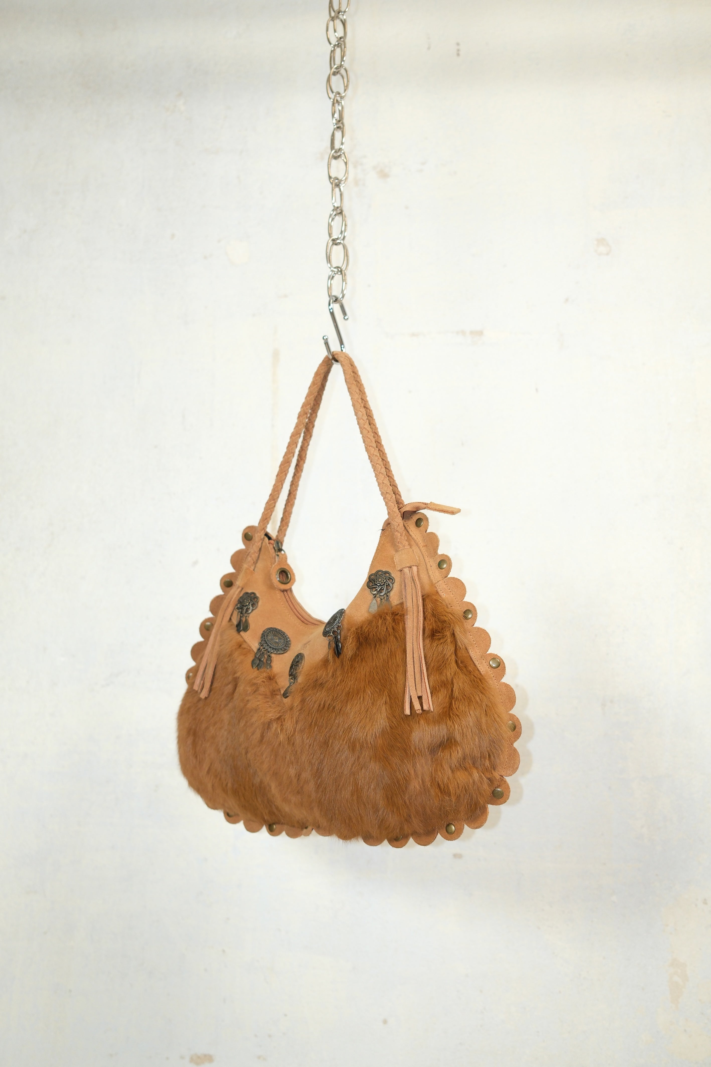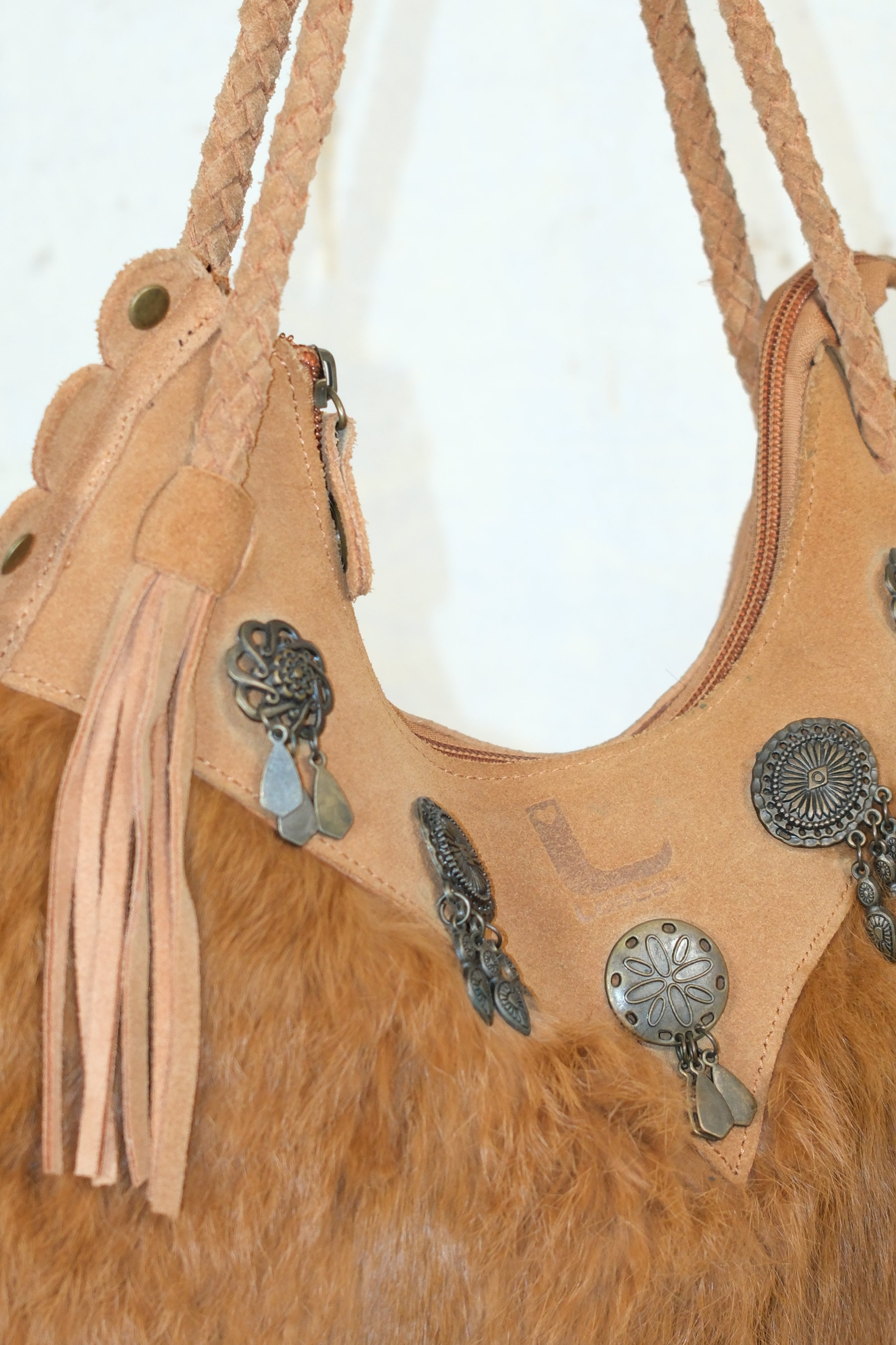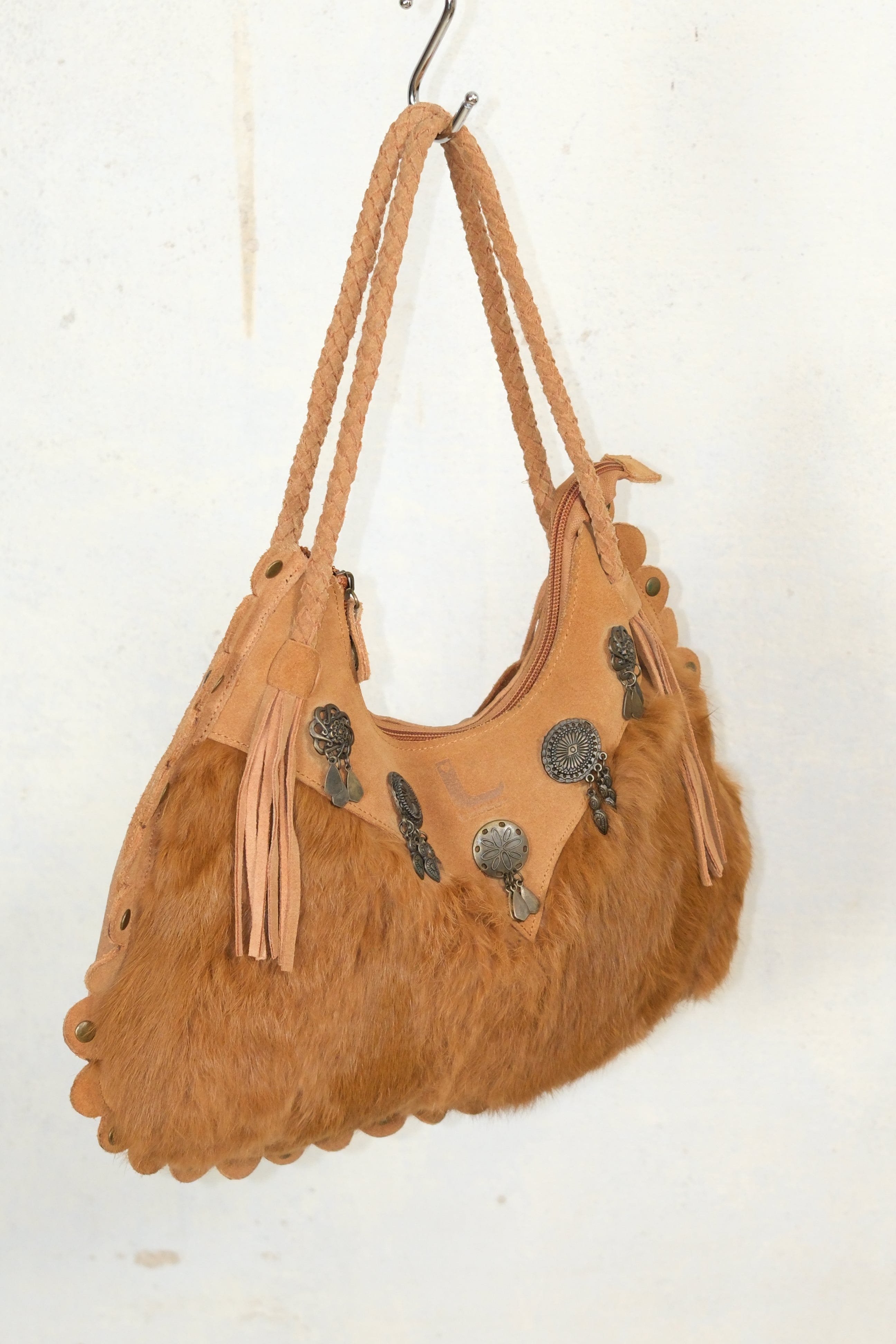 BOHO VINTAGE CAMEL BAG WITH RABBIT FUR