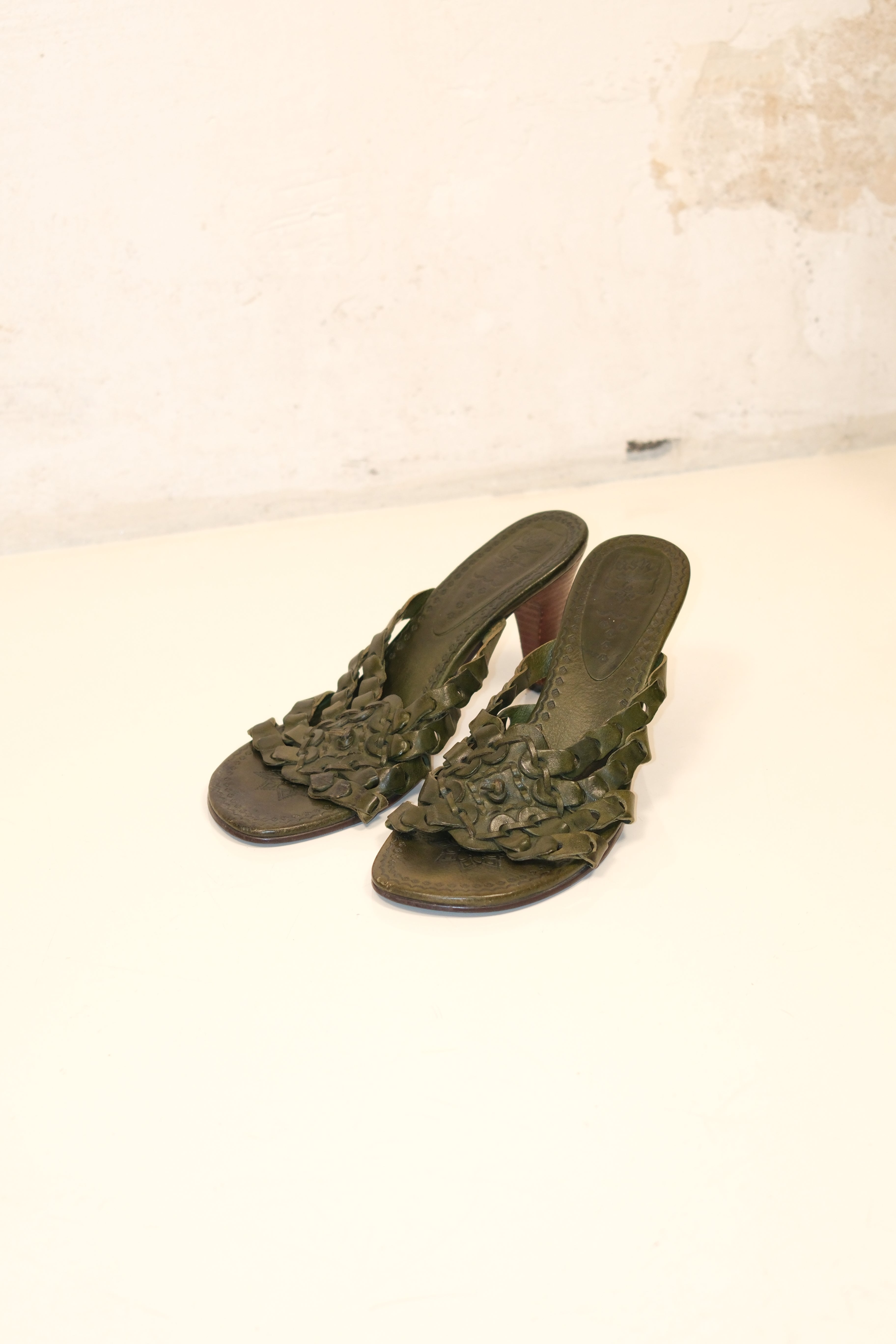Olive Green Woven Leather Heeled Sandals Boho Style with Mandala Details, size 39.5